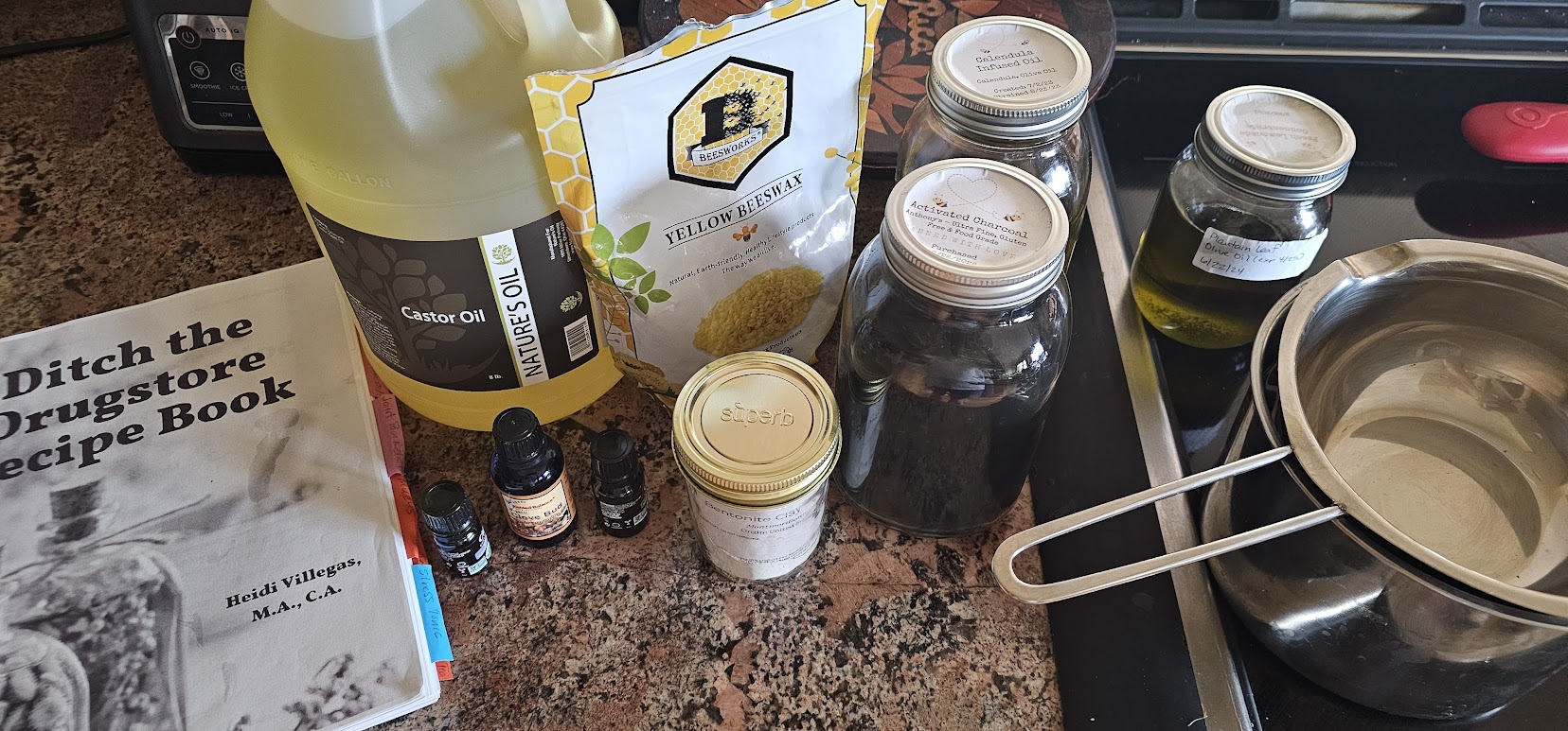 As for my infused oil concoction, I went all fancy and used two different oils for my 1/3 cup masterpiece. Half of it was Calendula-infused olive oil, and the other half was Plantain-infused olive oil — because why not mix it up a little? I’m keeping my creations cozy in two adorable 2-ounce tin containers. They’re practically begging for a tiny label that says “Potion No. 9!”   The recipe is in the Ditch the Drugstore book and on Heidi’s Healing Harvest Homestead website.