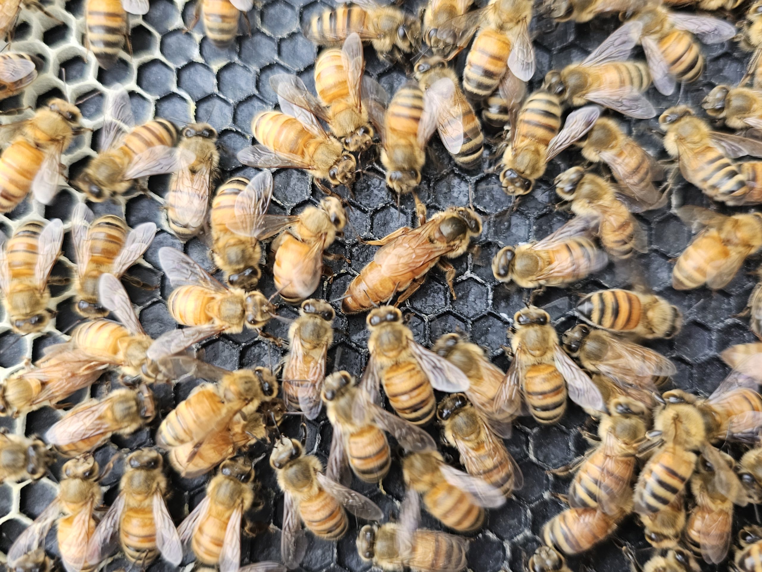 I quickly inspected the top box because there were a few agitated bees that were ready for me to finish. I pulled out one frame to inspect and I was happy to see the queen for the first time. I was happy to finally spot her. They looked to be building good brood on that frame. So I put them all back in and let them get back to work.