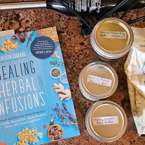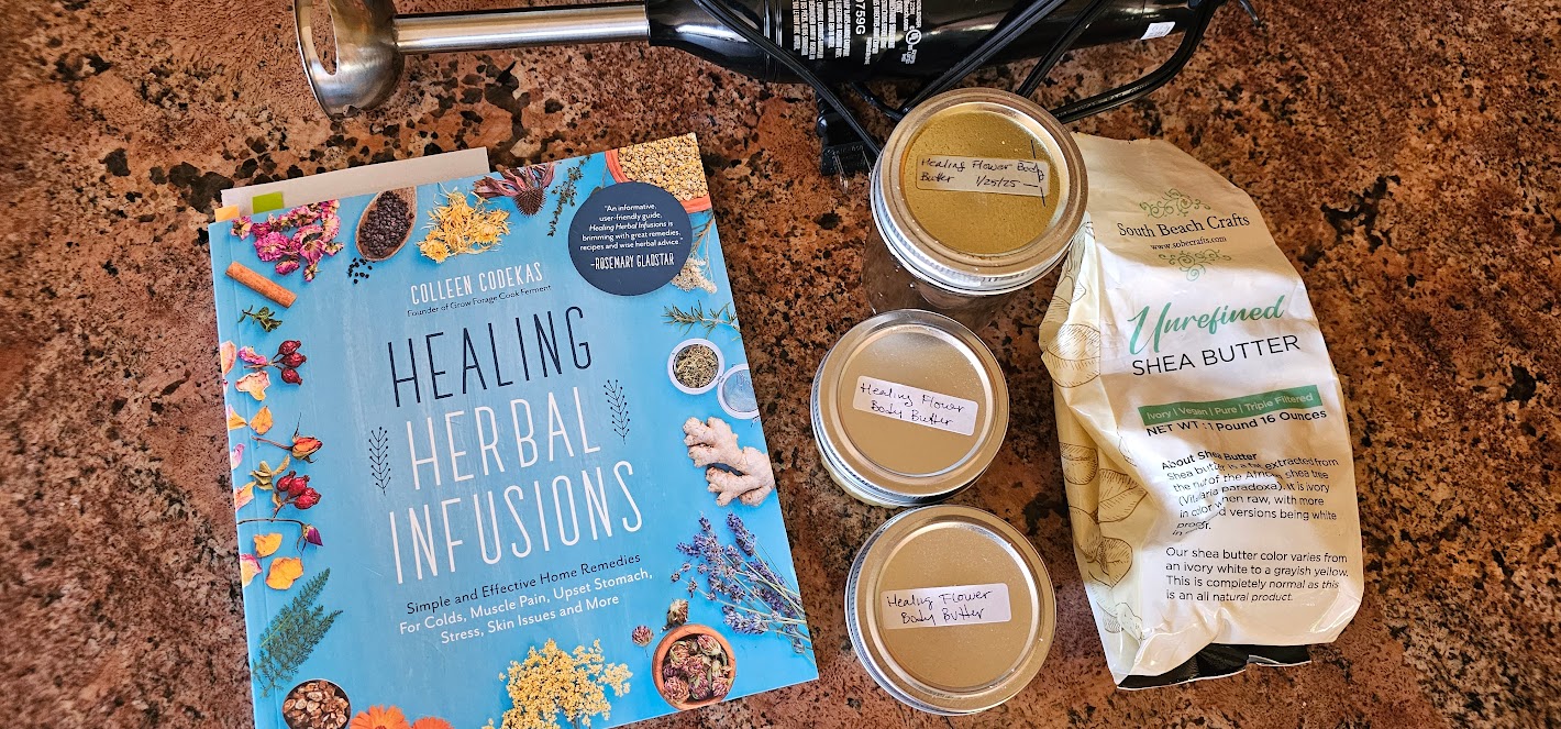 I’ve been searching for a body butter recipe that isn’t too greasy. I tried this recipe to check it out. I liked the ingredients so I decided to give it a try. I infused the Calendula, Lavender, and elderflowers for around 5ish weeks in a 8 oz mason jar. After the 5 weeks I strained the herbs to use in the body butter.