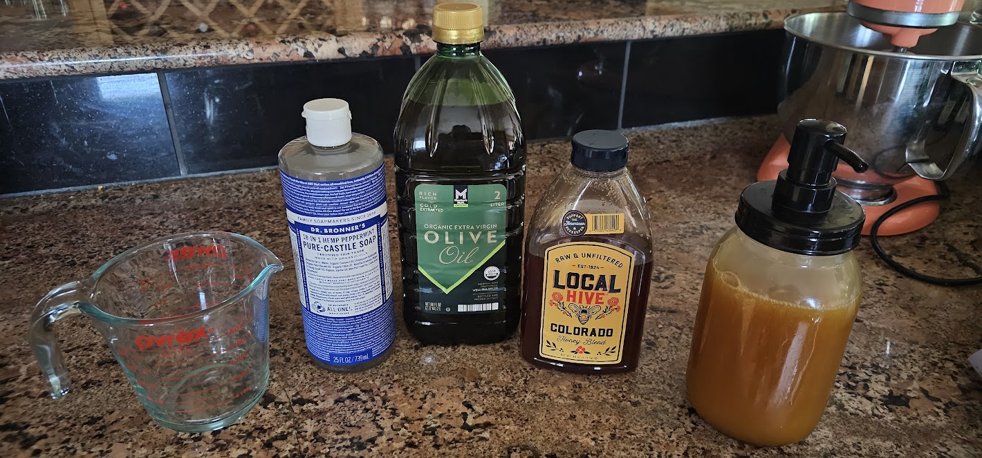 I was looking for a recipe to make a natural body soap when I found one online that caught my attention due to its simplicity. It only requires honey, oil, and castile soap. I’m a fan of castile soap because it’s effective at cleansing yet gentle on the skin. Since I reside in a dry climate, I’m particularly interested in a moisturizing soap, and the combination of oil and honey provides that extra hydration. I thought the honey might leave a sticky residue, but it’s really not that bad. It also thickens up the soap.