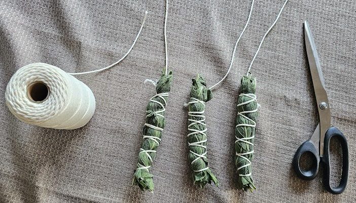 Yesterday, I had to cut back the sage in one of my gardens because it was overshadowing some jalapeno plants. Once I finished pruning, I collected the best leaves to make sage sticks. I shared a video below demonstrating how simple it is to create these sticks. After harvesting the leaves, I washed them and allowed them to dry overnight on paper plates that I sometimes use for drying herbs. By the next afternoon, they were mostly dry. Instead of arranging them in multiple bundles like she did in the video, I opted to layer 2-3 leaves at a time, ensuring they remained relatively even.