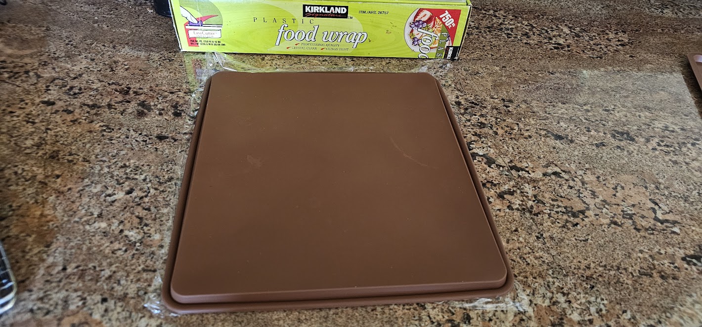 Once they’re done dehydrating, I put plastic wrap on top of the leather (left image), then flip it upside down (middle image), then i remove the silicone sheet (right image) and roll it up.