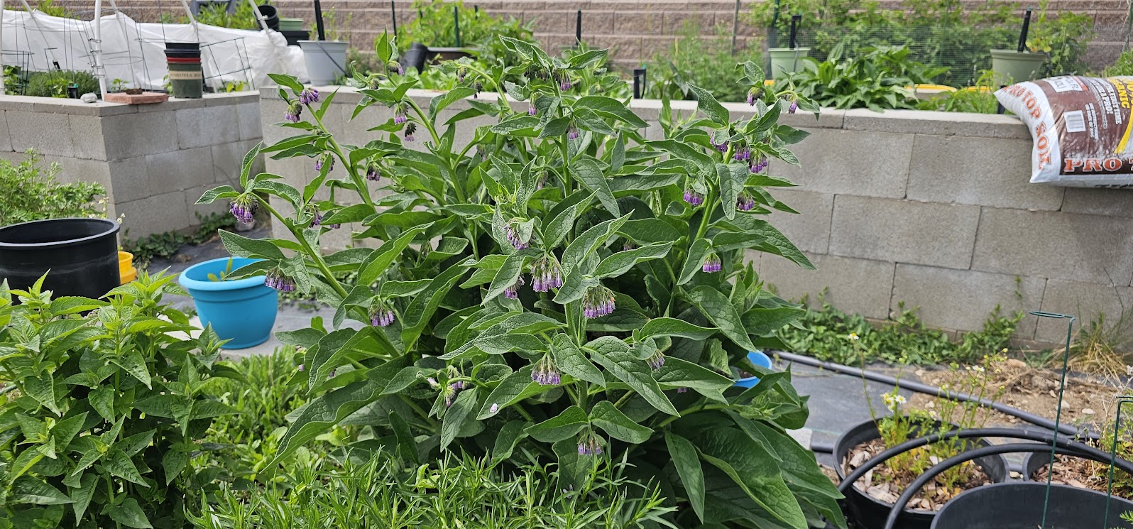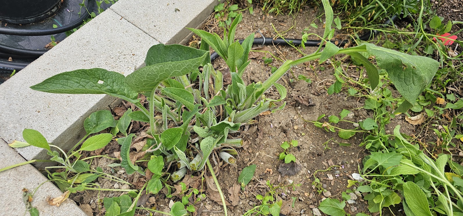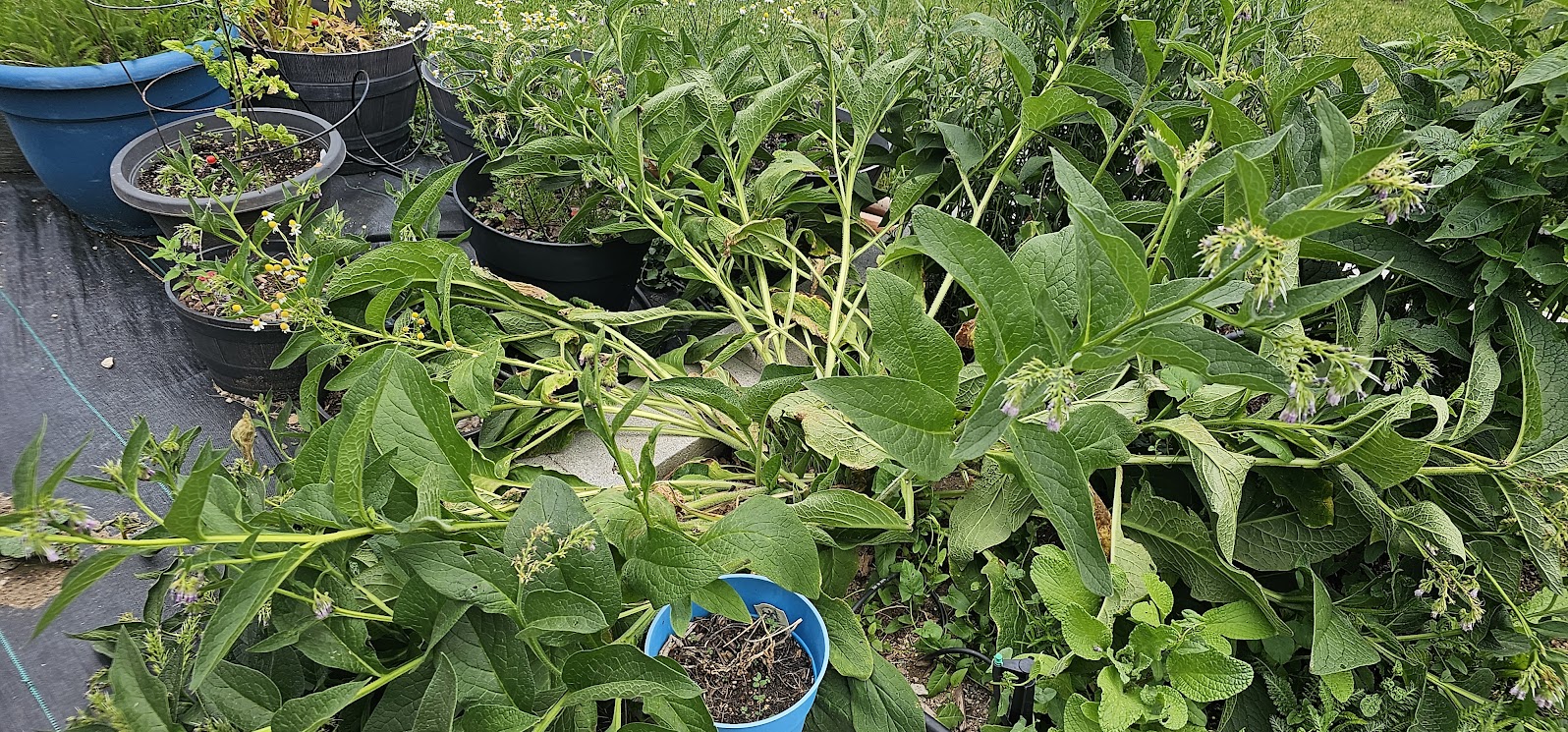 My Comfrey plants have grown excessively tall and unbalanced, causing them to lean over and cast shade on the neighboring plants. Therefore, it’s time to trim them back for the benefit of those surrounding them and to create more growth of Comfrey. Since the flowers are fading and have finished blooming, I don’t believe I’m depriving the bees of any resources. Pruning will actually encourage more blossoms to appear for them in the near future.