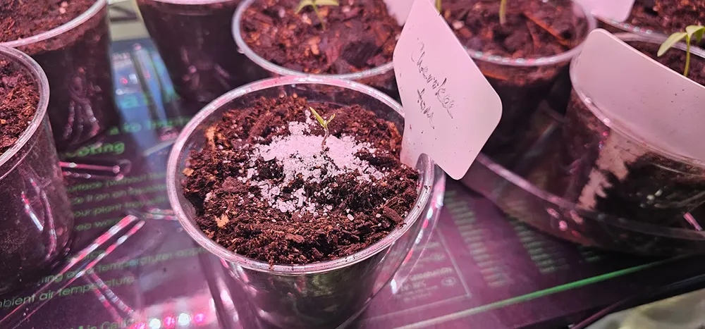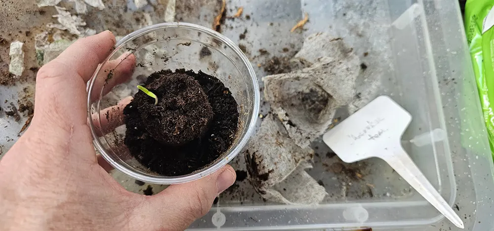 After the seedlings begin to grow, I begin moving them into cups. When multiple seedlings emerge, this is typically when I divide them and place each one in its own cup. To minimize the risk of transplant shock, I sprinkle Epsom salt on each seedling.